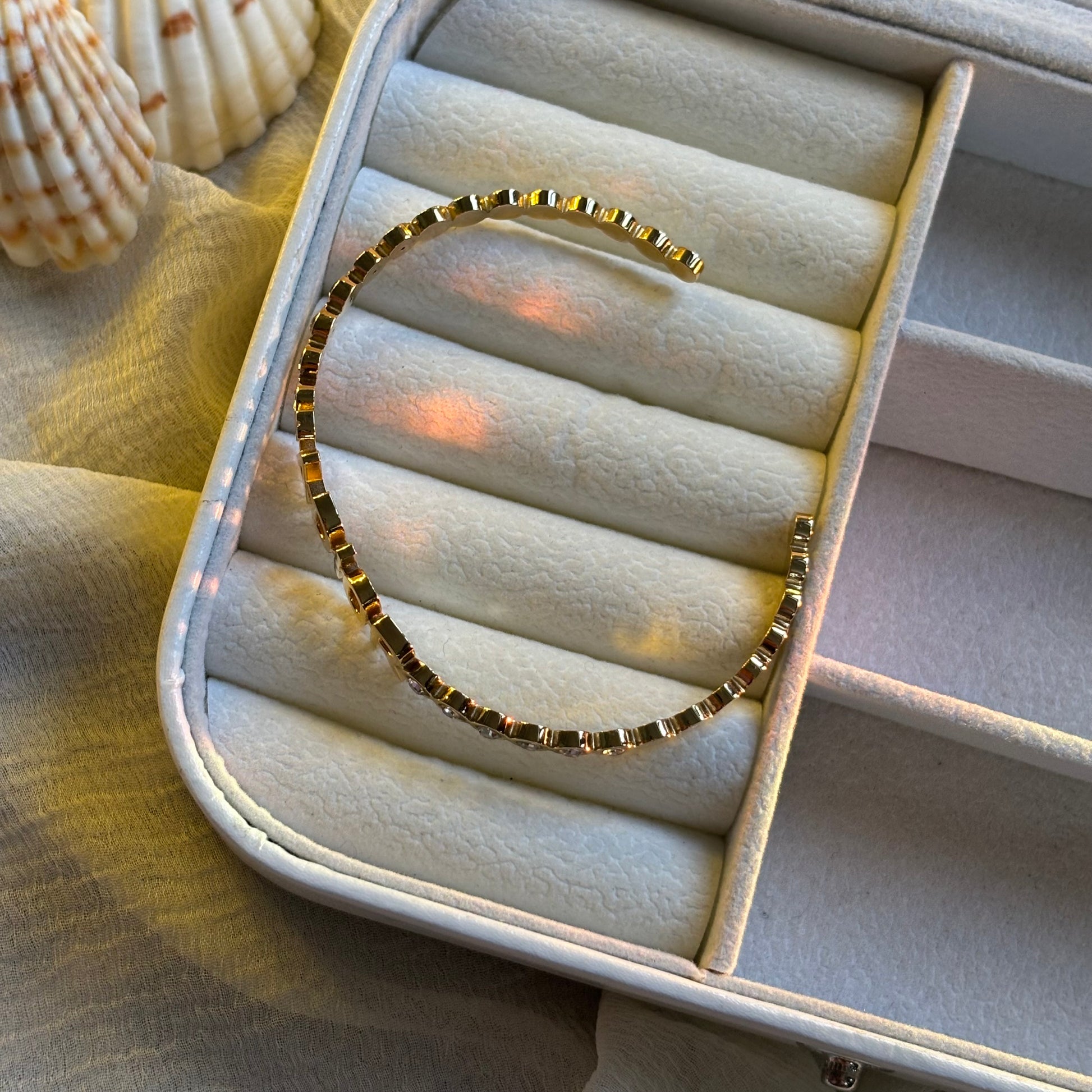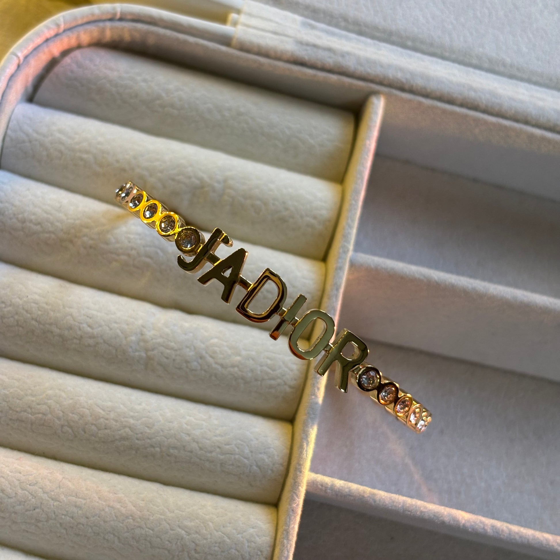 Add a touch of luxury to your outfit with the Diorra Adjustable Bracelet. Inspired by high-end brands, this gold plated bracelet is open and adjustable for a perfect fit. The anti-tarnish coating ensures long-lasting shine, while the stone studded design adds a glamorous touch. Light weight for comfortable wear.