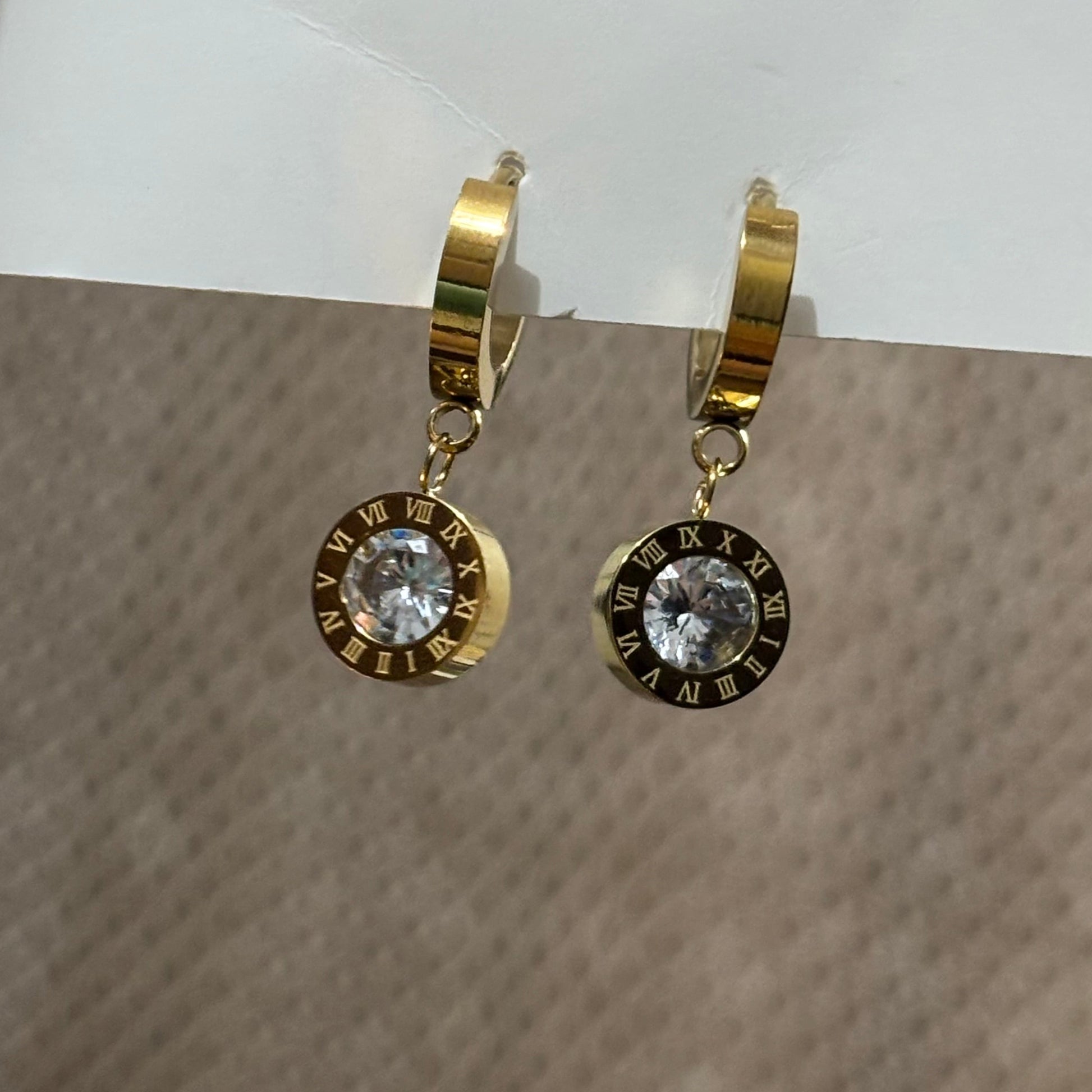 Make a statement with the Roman Drop Earrings, featuring elegant Roman numerals and sparkling stone accents. These gold-plated earrings offer a timeless shine and resist tarnish, ensuring lasting sophistication. Perfect for adding a classy touch to any ensemble, they blend classic design with modern durability.