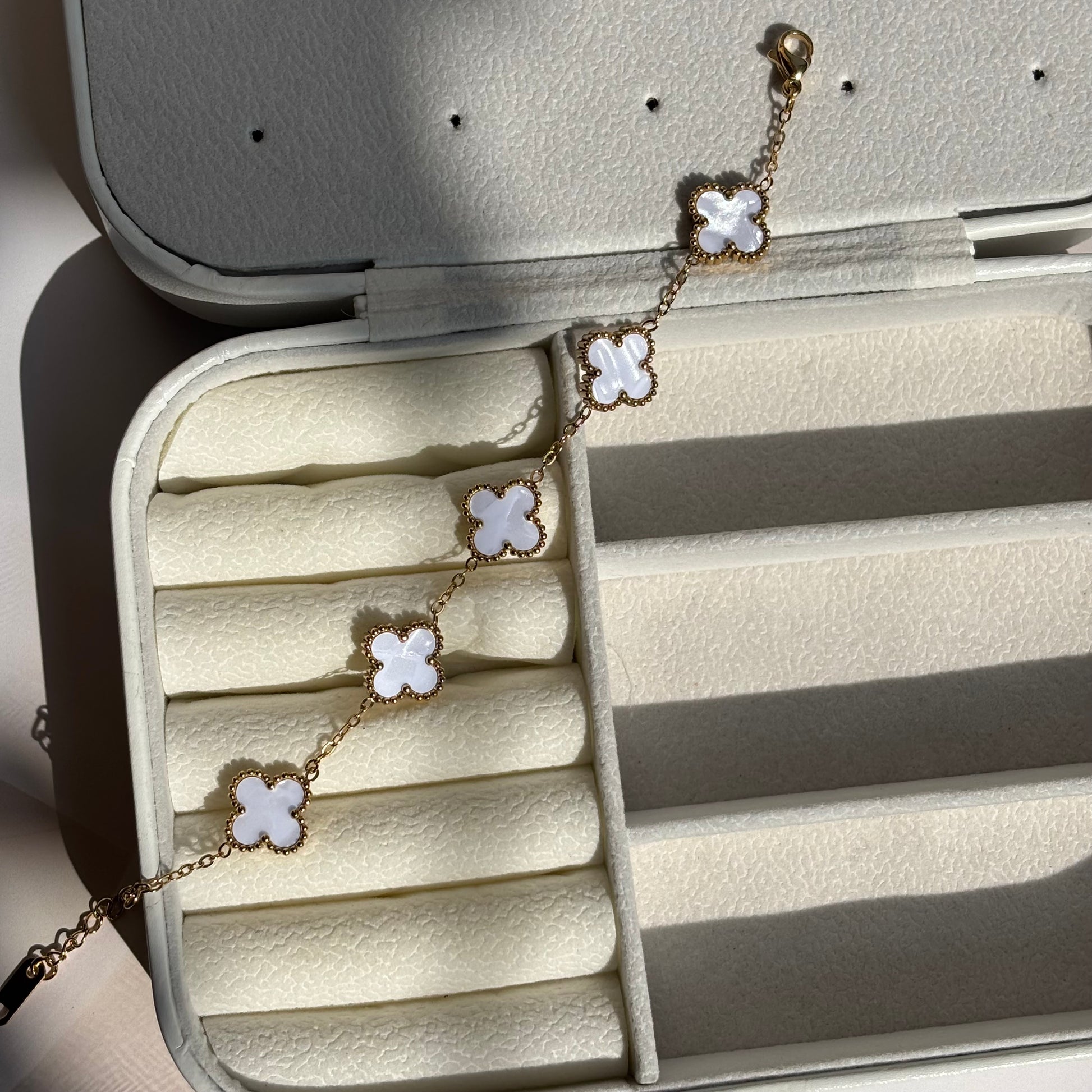 Be captivated by the unique beauty of our Clover Bracelet. Crafted with exquisite detail, this bracelet features a delicate clover design that is sure to bring luck and fortune into your life. Adorn your wrist and elevate your style with this enchanting piece.